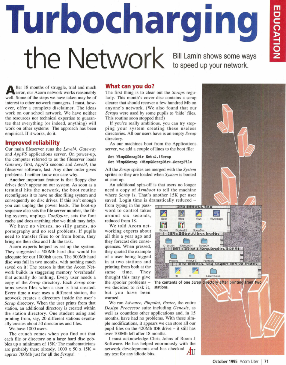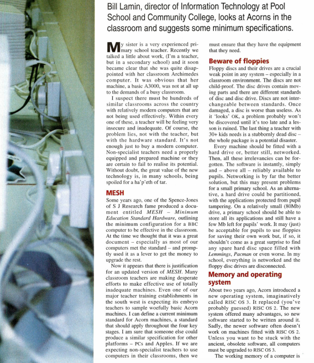Bill was an enthusiastic Maths and IT teacher, usually working against the grain of the local education authority - sticking by his decision to use IT as a tool. He felt it was more important to learn skills than specific applications, so rather than opting for the county 'RM' strategy, Bill took his school down the Acorn route. There was no waiting around for Windows to load at the start of the lesson, the computers were ready in less than a minute - lesson time could be spent learning rather than waiting.